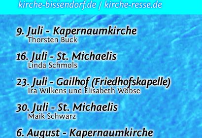 Die Kirchengemeinden St. Michaelis Bissendorf und Kapernaum Resse feiern vom 9. Juli bis 13. August Sommerkirche. Wassergeschichten - unter diesem Motto stehen die Gottesdienste an allen Orten.