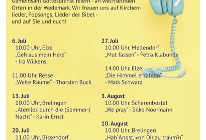 In der Wedemark feiern wir "Sommerkirche". Unter dem Motto "Ich sing Dir mein Lied" stehen Kirchenlieder, Popsongs oder die Lieder der Bibel im Mittelpunkt unserer Gottesdienste - wir freuen uns auf Sie und euch!