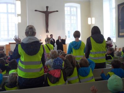 „Normalerweise feiern wir Kinderkirche bei den Kindern in der Kita, heute wollten wir den Kindern einen Ausflug ermöglichen“, beschreibt Pastorin Lonkwitz die Idee. Wie hört es sich an in einer Kirche? Wie klingt es, wenn in der Kirche alle laut oder leise singen? Wie riecht es? – Das sind Entdeckungen, die man nur vor Ort machen kann. Und so zogen die Kinder mit leichter Verspätung unter Glockengeläut in die Kirche ein und hörten dort auf die Stille in einem Raum, der ganz anders klingt als die Gruppenräume in den Kindergärten.